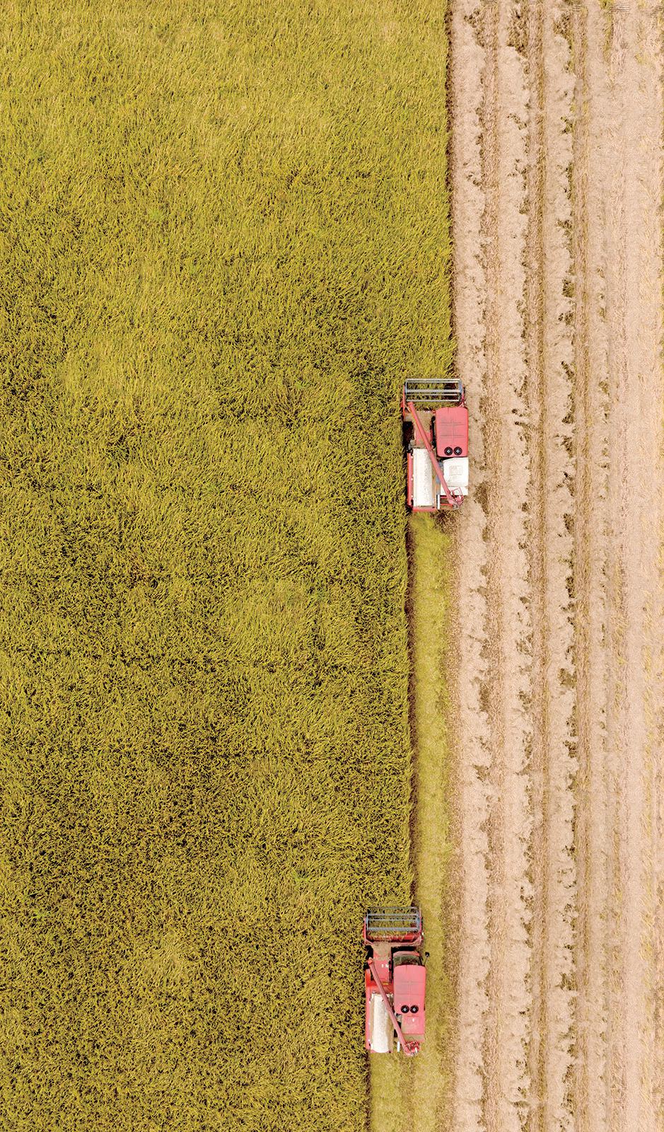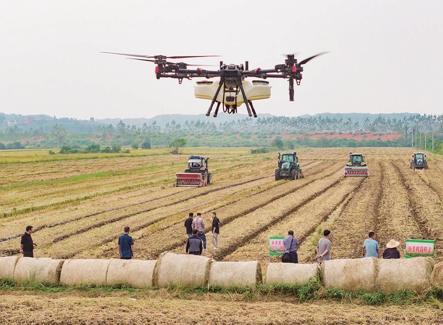 14日,在陽新縣荊頭山農(nóng)場(chǎng),多臺(tái)農(nóng)機(jī)在金黃色的稻田里來回奔忙,植保無人機(jī)在空中播撒油菜籽。時(shí)值金秋,陽新41.8萬畝水稻全面進(jìn)入成熟期,全縣1000余臺(tái)智能農(nóng)機(jī)穿梭田間,按下秋收“快進(jìn)鍵”,為全年糧食豐收筑牢堅(jiān)實(shí)基礎(chǔ)。陽新計(jì)劃今年油菜播種面積35萬畝,小麥播種面積6.6萬畝。
