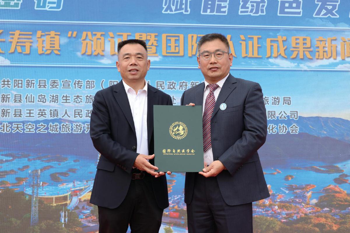 10月29日,正值重陽佳節(jié),秋高氣爽,陽新縣王英鎮(zhèn)天空之城景區(qū)人潮涌動。在眾多游客的矚目下,一場“探尋長壽密碼 賦能綠色發(fā)展——王英仙島湖‘世界長壽鎮(zhèn)’頒證暨國際認(rèn)證成果新聞發(fā)布會”舉行。