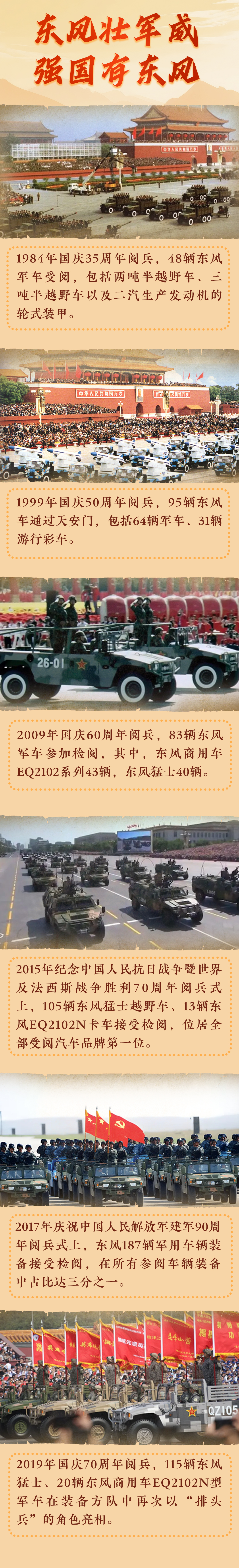 東風因軍而建、因軍而興、因軍而榮。在過去的四十多年,東風軍車已經(jīng)6次光榮接受黨和人民檢閱,創(chuàng)造著“零失誤、零誤差、零故障、零事故”的傳奇紀錄。